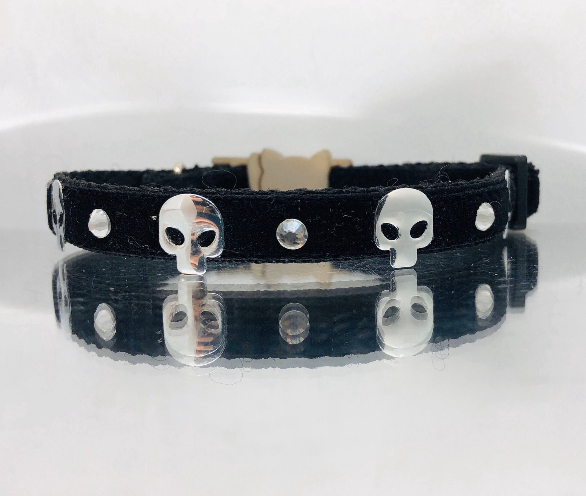 Black Velvet Goth Kitty Safety Collar with Silver  Skulls, Optional Diamantés & Bell