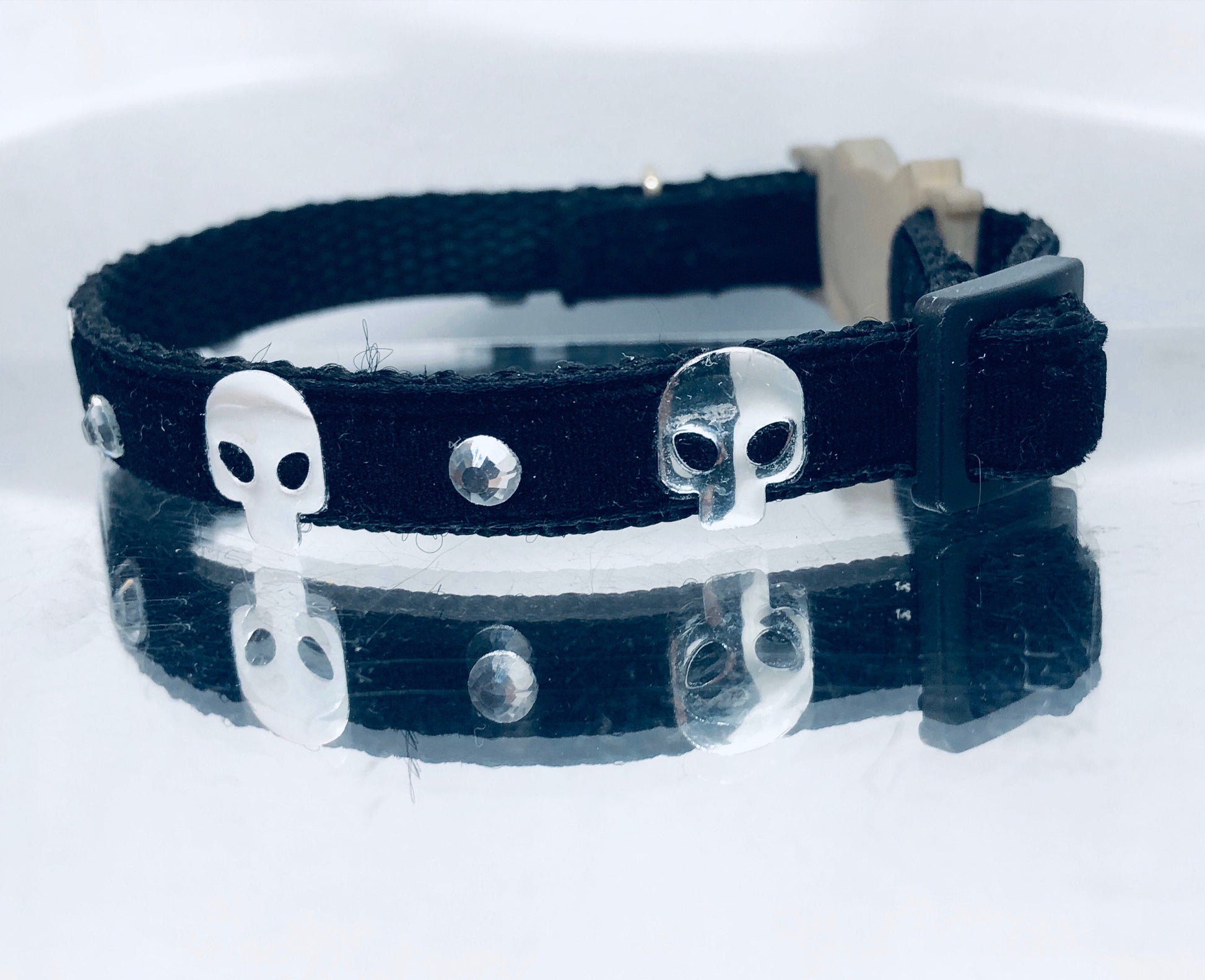 Skull charm, available with or without diamantés - secure, soldered embellishments won’t detach easily. • Customisable fit — choose Kitten (6″–8½″) or Cat (7″–10″); custom sizing available free of charge.