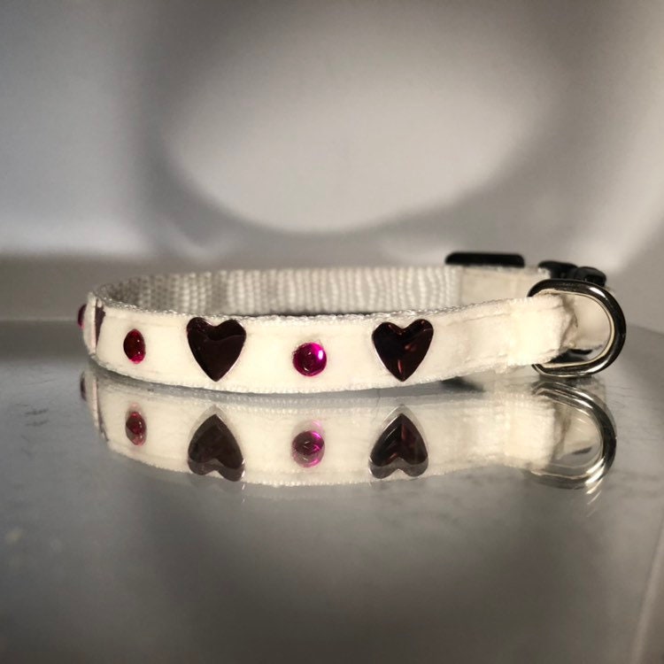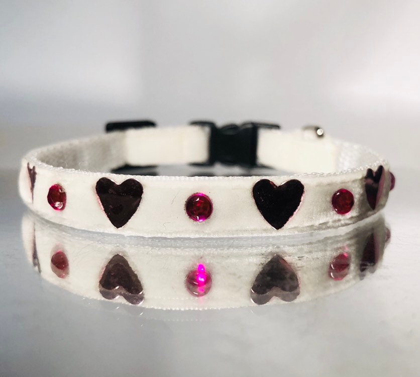 Hand embellished with Pale Pink Hearts and dark pink diamanté’s which have been securely soldered in place. All collars come with a Removable Bell